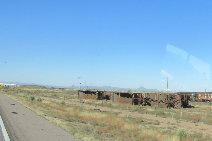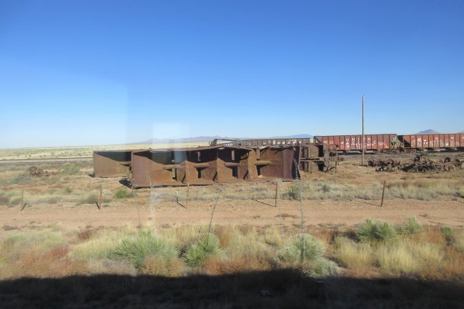 It is kind of hard to see, but these are train car on there side after a derailment.