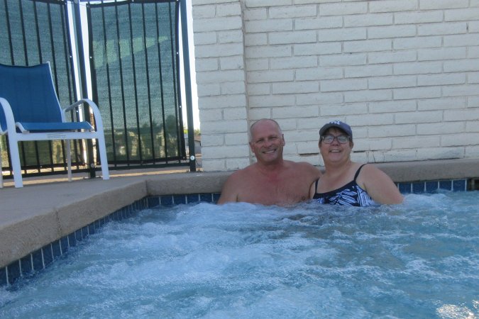 We went to the hot tub after supper. It rained for about 10 minutes while we were in the hot tub.
