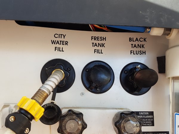 These are the water connections we have on the MH. The center one is the one used to fill the fresh-water tank.