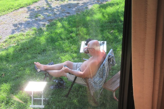 I am out biking around the back of the campground on a little short trail (4.6 km). Once again, it is hot and humid.