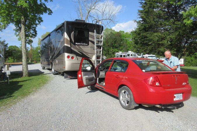 Time to hit the road. Once the used water tanks are emptied, we hooked up the car to the MH.