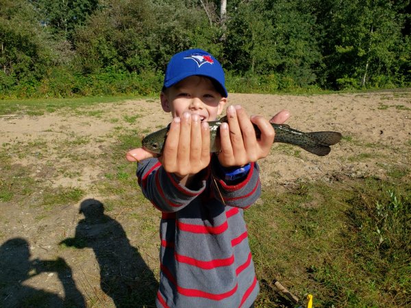 Jeremy caught a trout and Gabriel pulled it in. Team work.