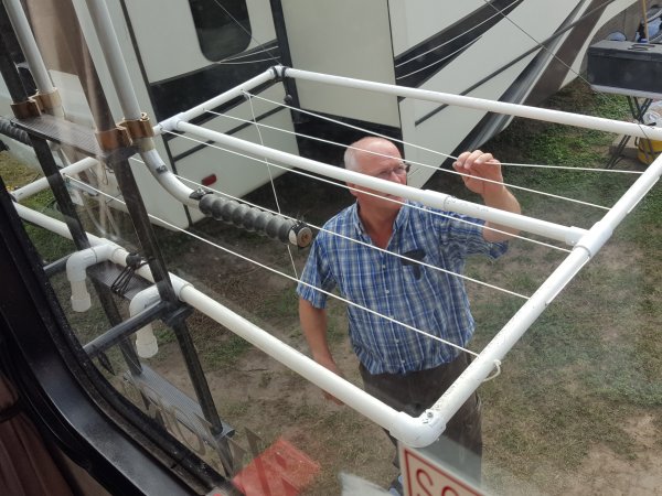 I am changing the rope on our solar cloth drier. The old rope was dried and rotten.