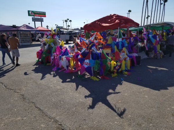 We went to the Mercadome flea market. We saw many Piñatas and bags of candies to put in them.