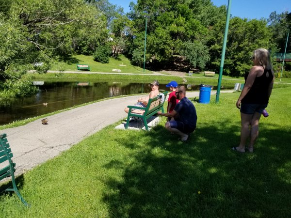The man on the bench offered some bread to Gabriel to feed the ducks.