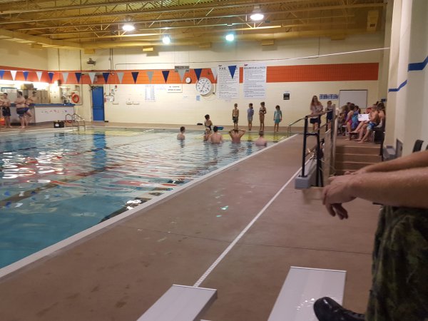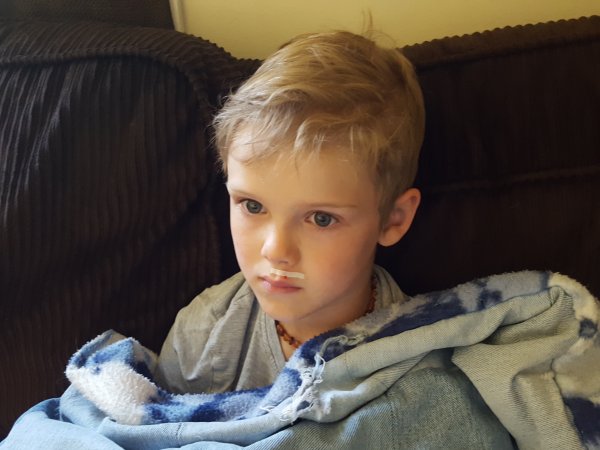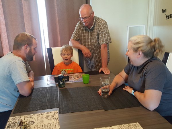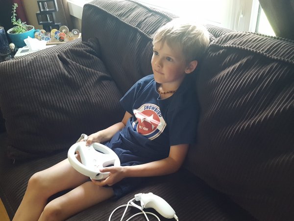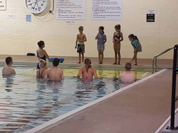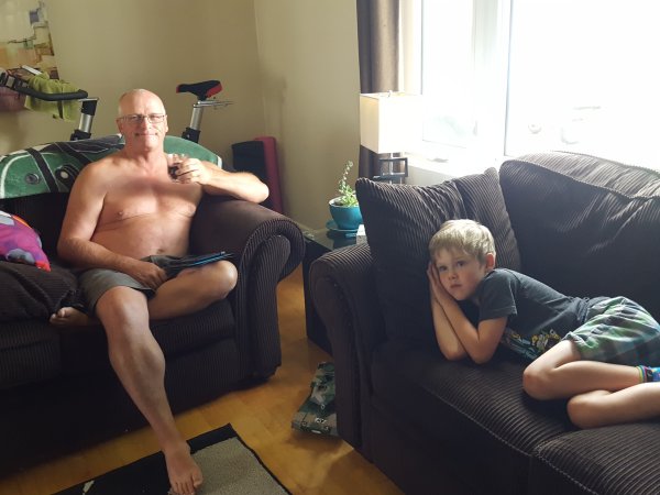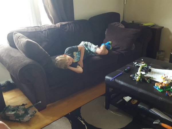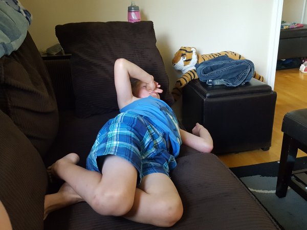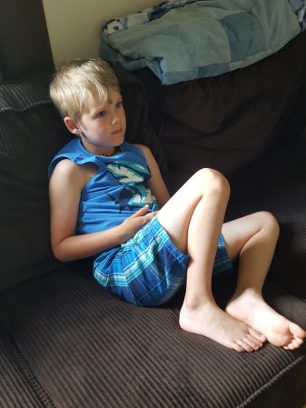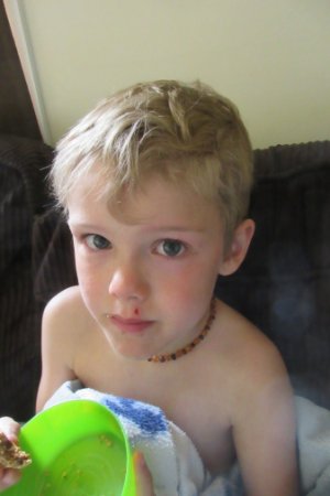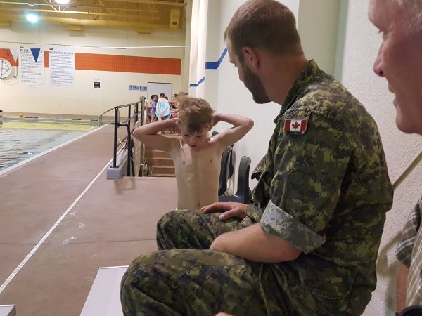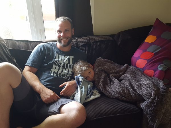 Gabriel is telling us how his swimming lessons went. He is very happy, but tired.