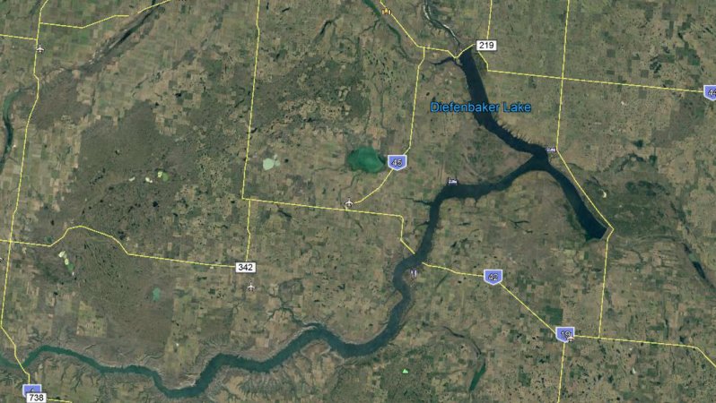 Diefenbaker Lake. Diefenbaker is about 130 km from Moose Jaw. It is a