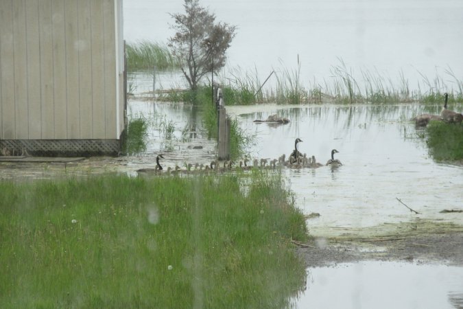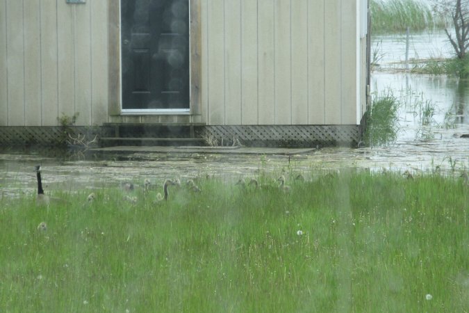 Cute sight, several families of geese came into the tall flooded grass to feed.