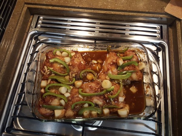 Chicken with Apricot jam and other stuff. It is just delicious.