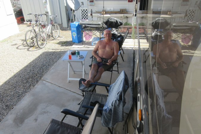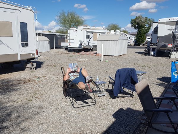After the clubhouse, we sat outside reading, me in the shade and Michele in the sun.