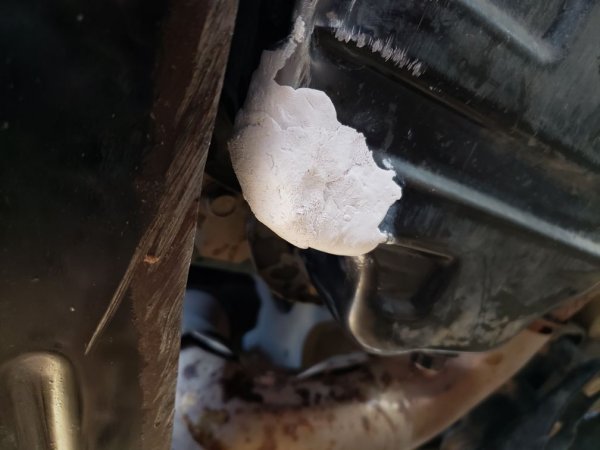 Jeremy sent us these photos. A rock hit his oil pan and punctured a hole into it.