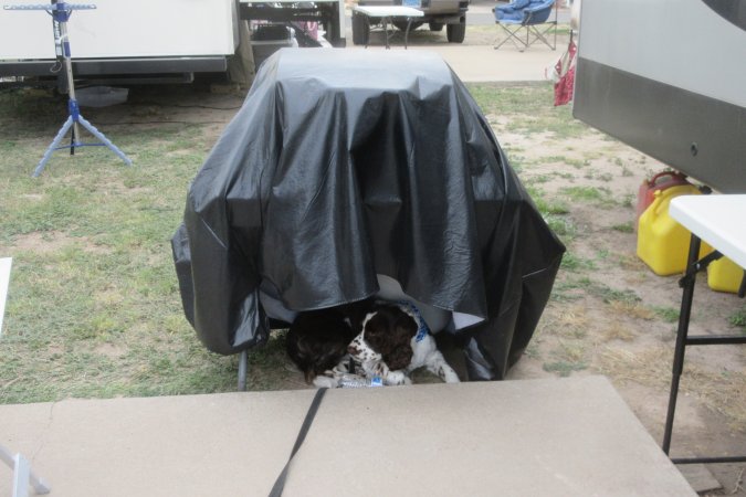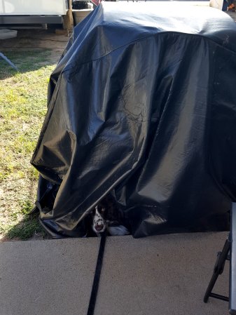 It is hot and Flick still goes under the BBQ cover to rest !?!? It must be some hot under there.