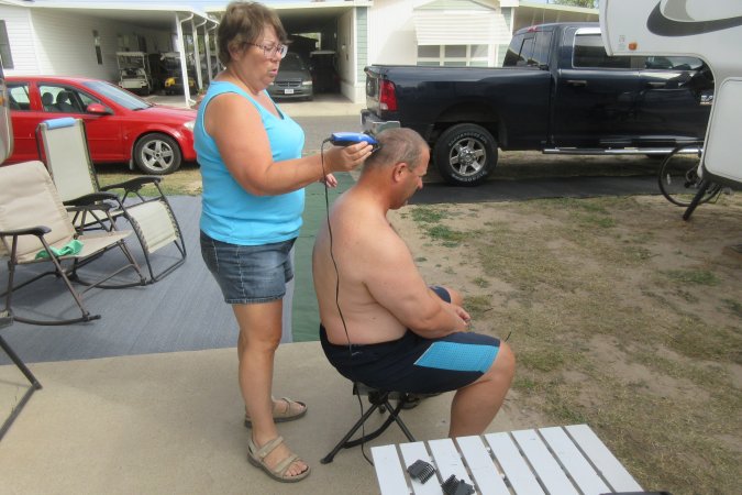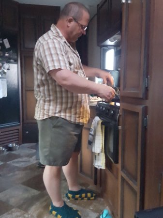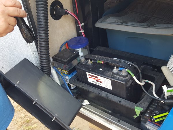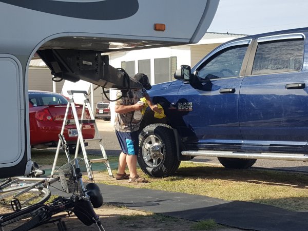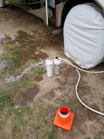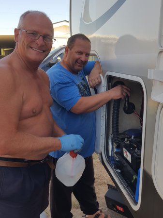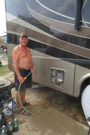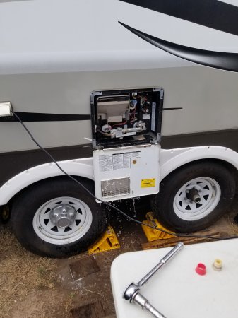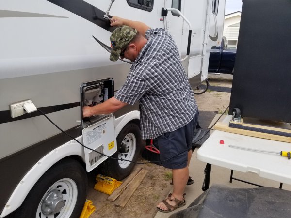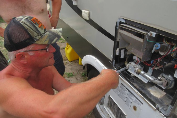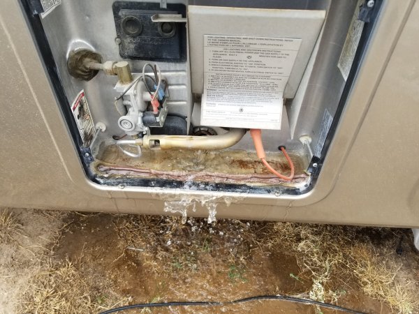 He over torques the plastic plug on the hot water tank. Off to the RV