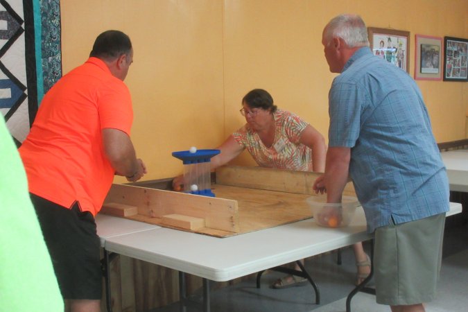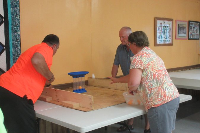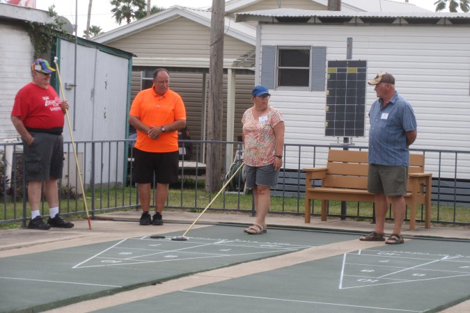 Michele has Louise in her team. Louise is very proud of her shot. Andre is the captain.