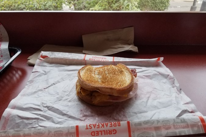 What a breakfast sandwich! Two eggs, cheeses, bacon and sausages on toast.