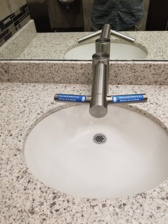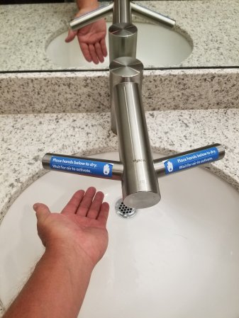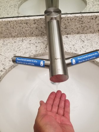 The water comes from the center and the "wings" are for drying your hands. Who makes this? Dyson of course.