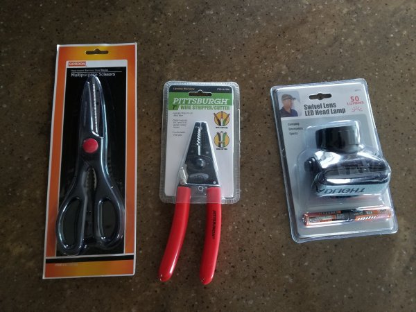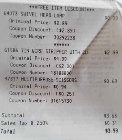Now the bill. The prices are very good. The head lamp was free, the wire stripper only $2.99 and the scissors were only $0.69.