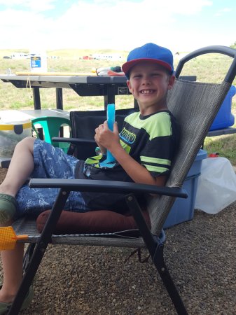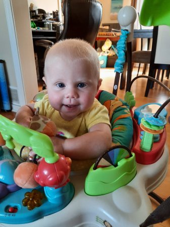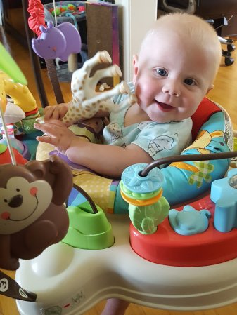 He is so happy with his bison. Look at the green dog tag around his neck.