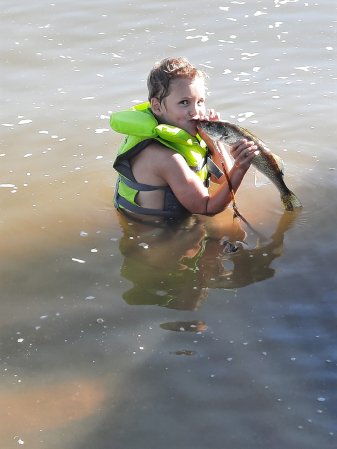 Jeremy caught a walleye. Gabriel is more excited than his Dad. Gabriel is the net guy.