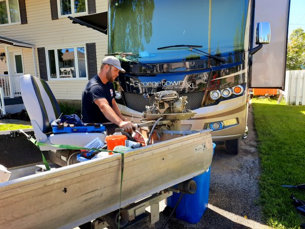 Jeremy found an out-board motor like the one he has for $700. It deals for a bit and gets it for $600.