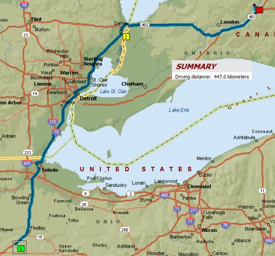 We will be crossing the border into Canada at Sarnia, Ontario.