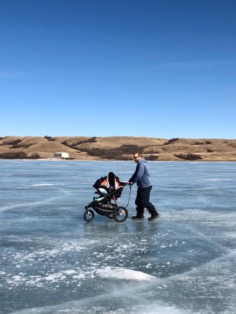 Jeremy walking with Natasha on ice whiles ice fishing. Poor Natasha, she seems to have a very difficult life!