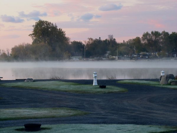 It was a cold night, -1° C. Look at the frost on the grass and the fog on the water.