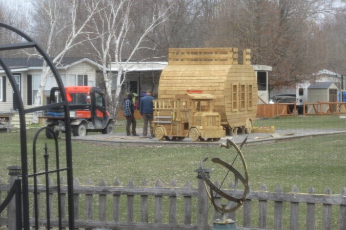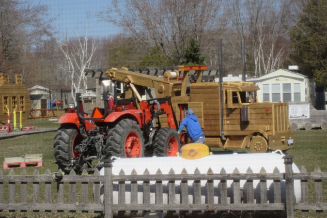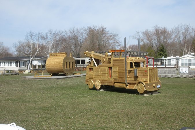 This is what we have accomplished so far. We placed concrete blocs under the tow truck and the kid's trailer in place.