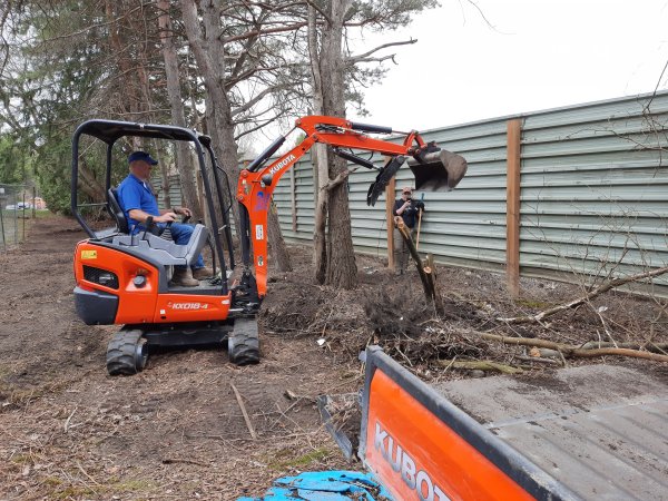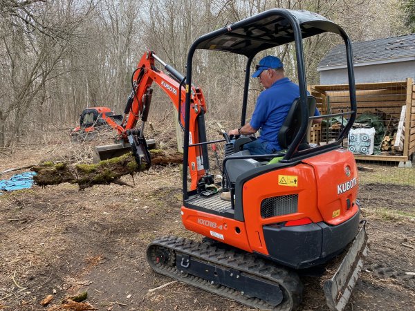 I am back at work this morning. We are removing the old stump and preparing the ground for topsoil and sod later on.