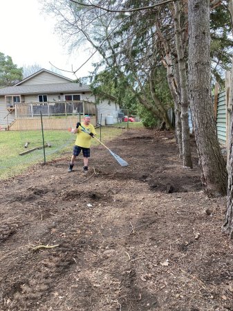 We fill the holes with dirt. Jan does a quick "landscaping" with the