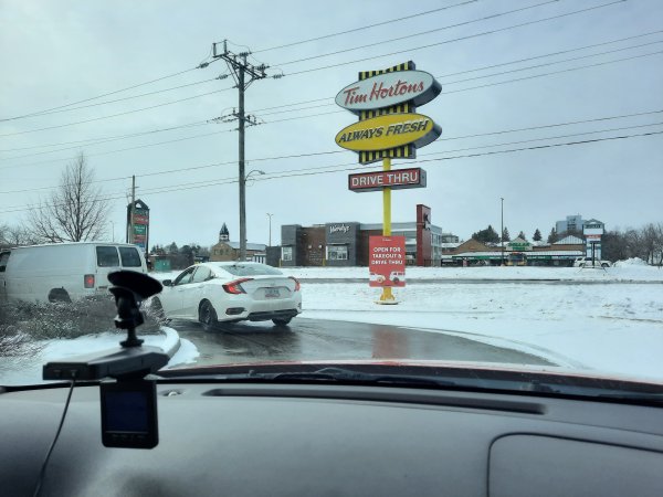 (Photo from Google Earth, no snow) Just waiting in the car listening to a podcast.