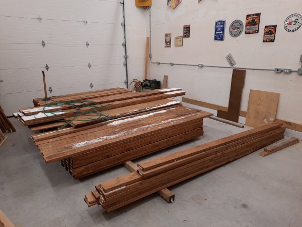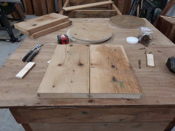 I add two 2X8 pieces of lumber to the already cut wheel. They will be cut again later on.