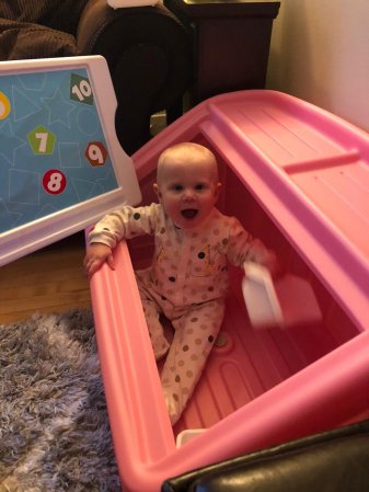 Kristin and Jeremy sent us the photo of the gift "we" bought for Natasha's Birthday. A toy chest with a board integrated.