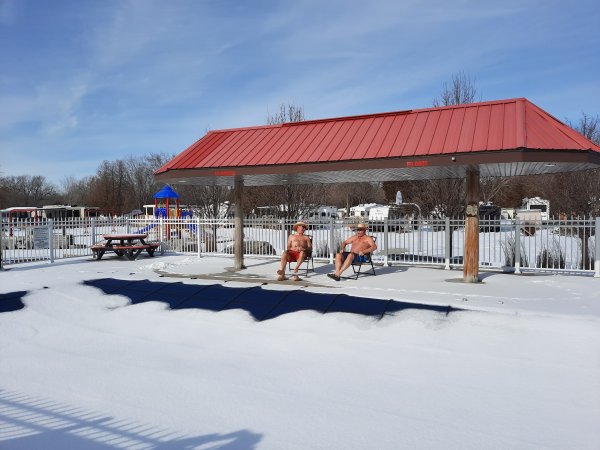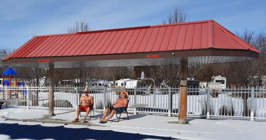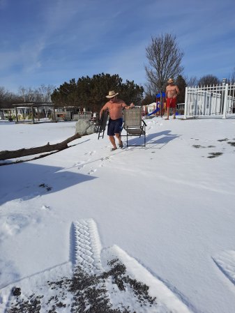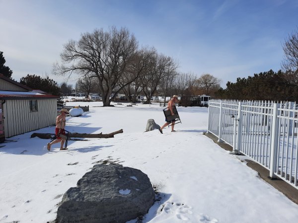It is -7° C with a light wind from the Lake. On our way to the pool.