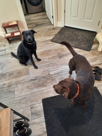 Jannie is babysitting Patricia's dogs. Charger, the black one and diesel, the brown one.