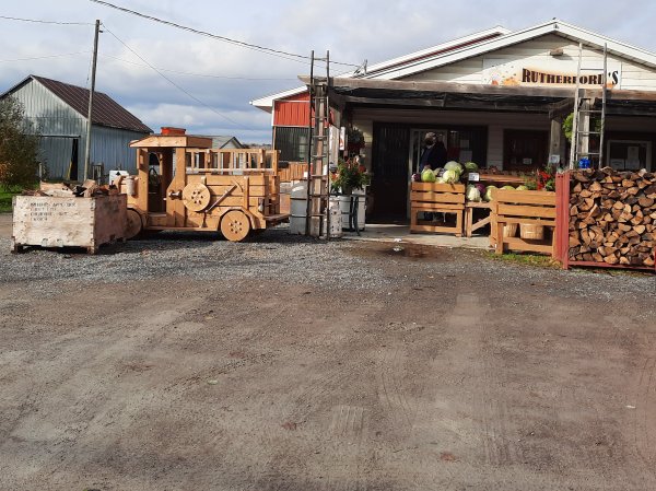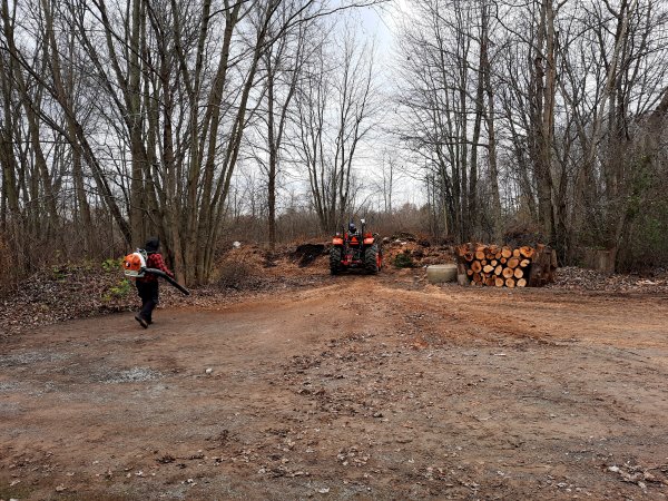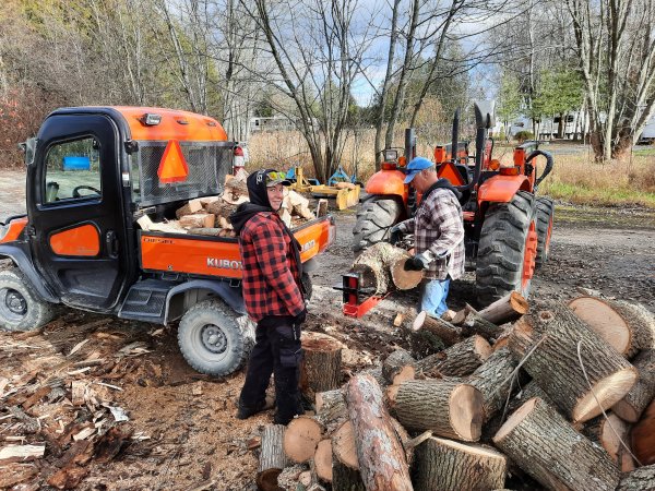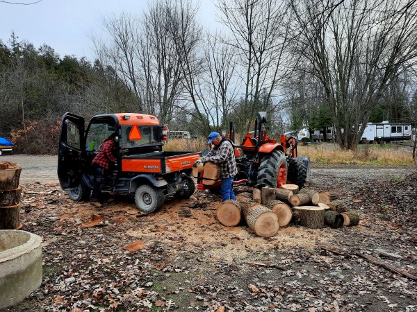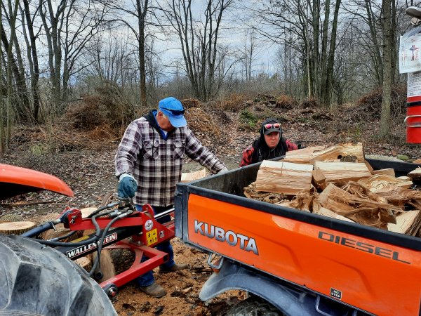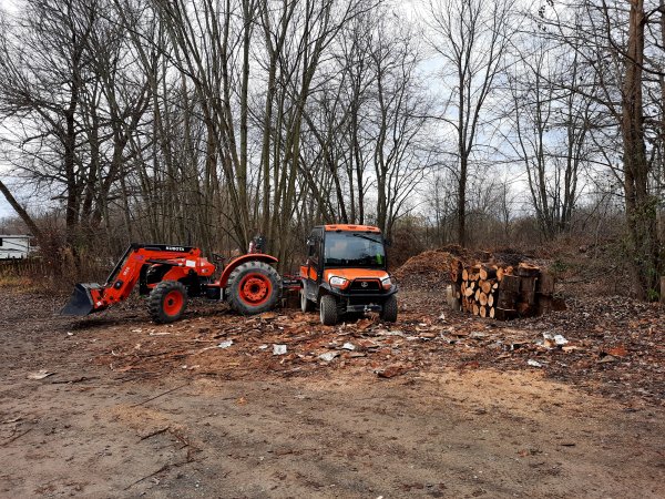 Kubota. Patricia and I drive the Kubota back and forth. We stack the
