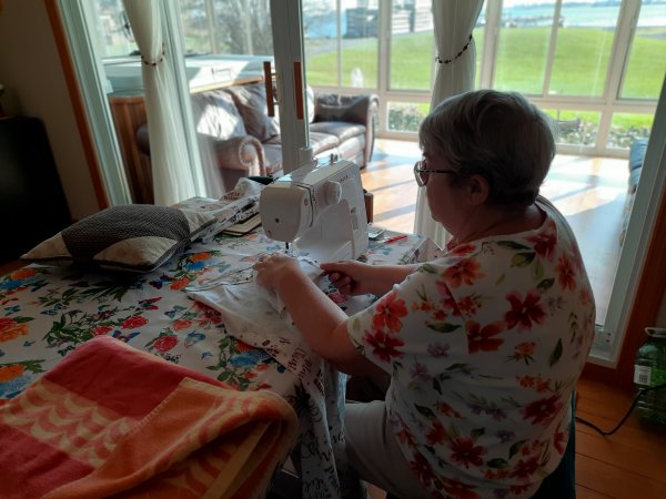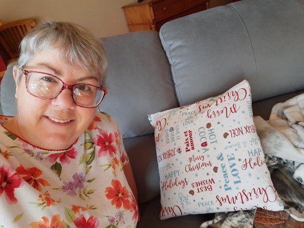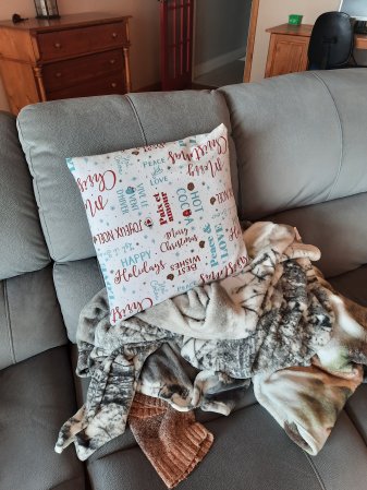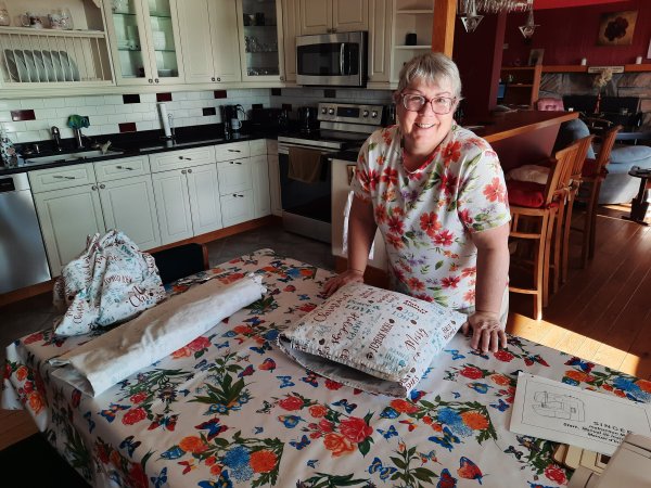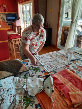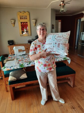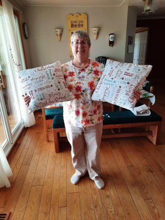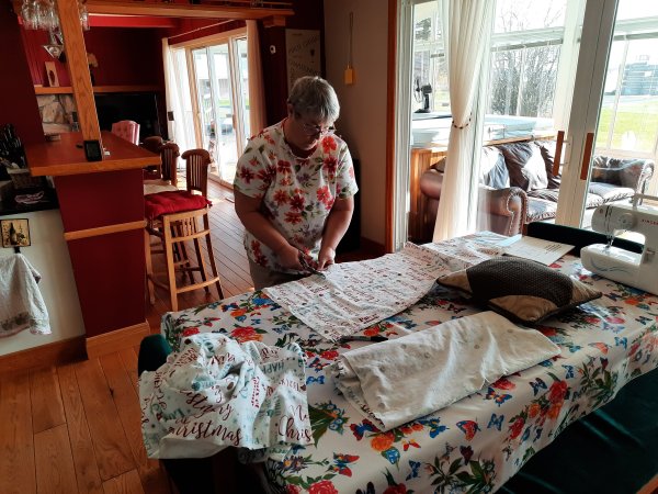 Michele found a Christmas bed sheet at the thrift store. She is using it to make Christmas cushion covers.