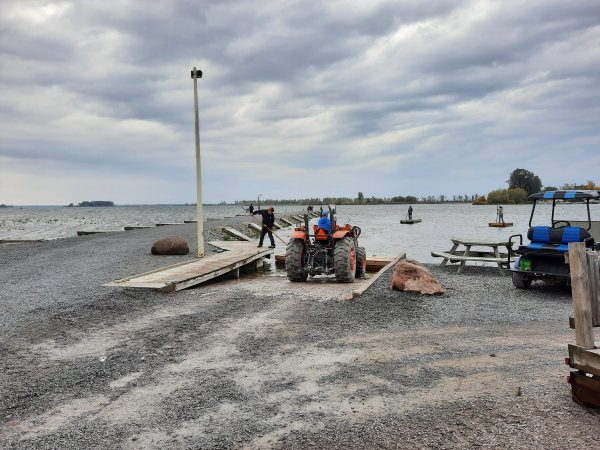 Once the docks are unhooked, they are floated to the boat launch where Jan picks them up with the tractor.