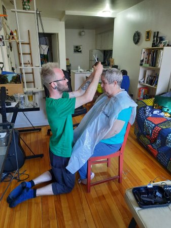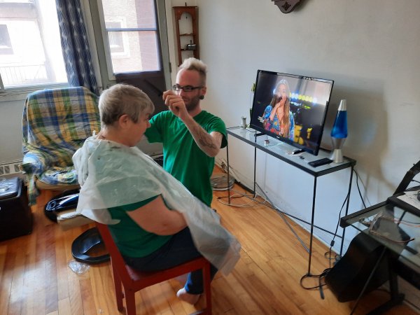 Now that everything is on the wall that needs to be on the wall, Benoit cuts Michele's hair.