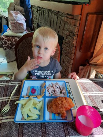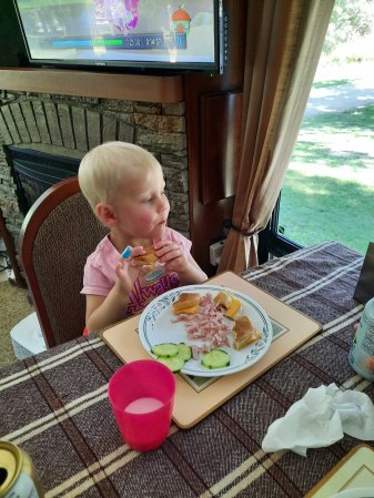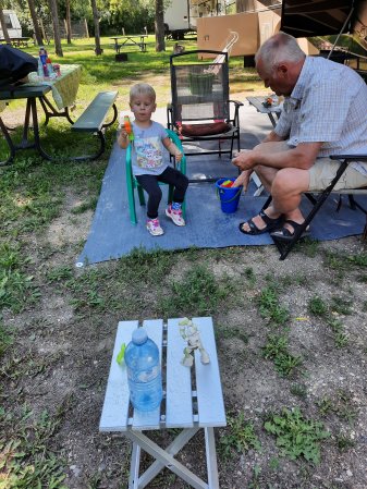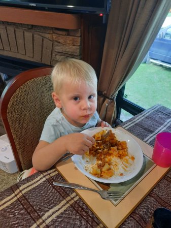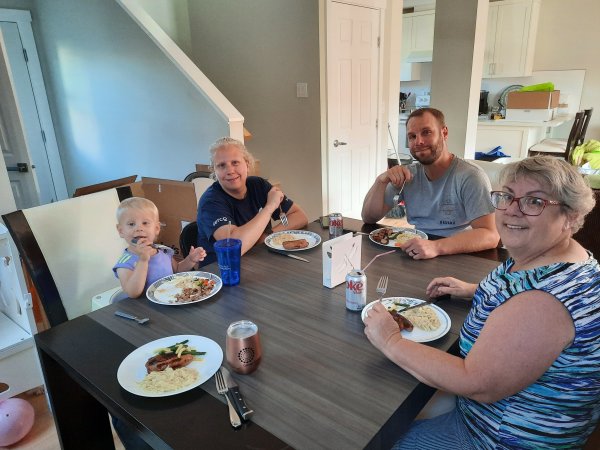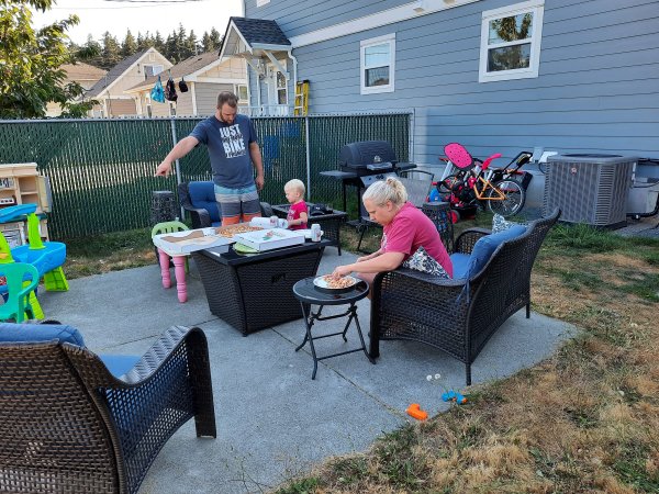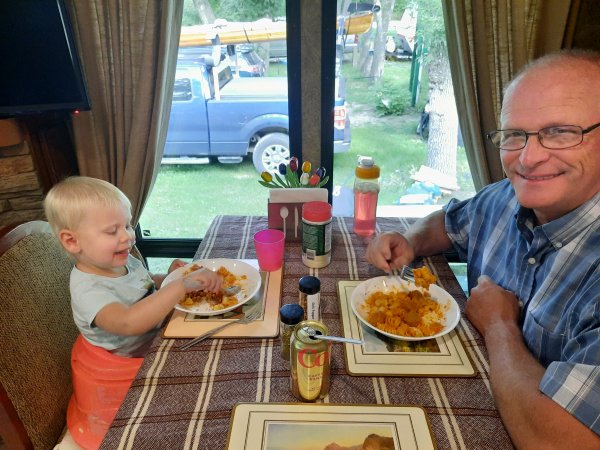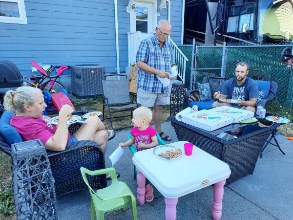 Supper is pizza tonight. It is excellent. You can eat outside because there are no mosquitoes.