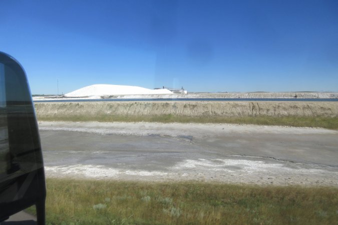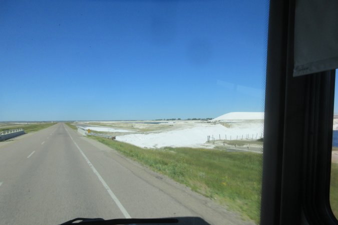 We drive by the small town of Chaplin with its Sodium Sulfate mine. It looks like snow.