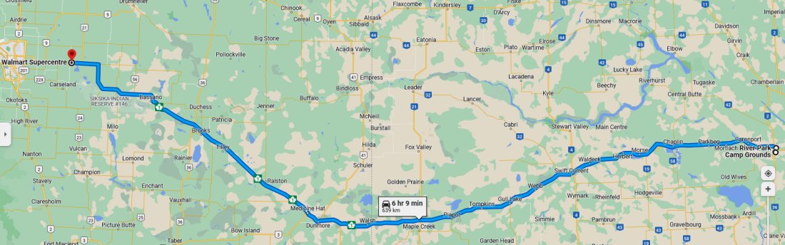 We arrived at the Walmart in Strathmore around 4:15 pm. We drove 639 km in 8 hours.