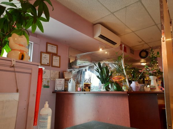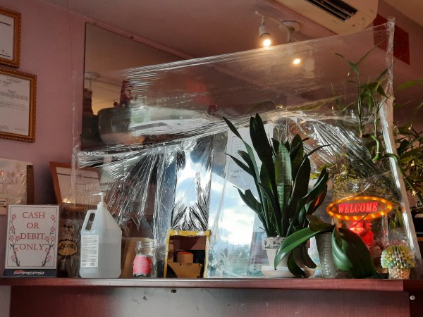 I have to say, Chinese people are resourceful. They used saran wrap to create a barrier between customers and employees.