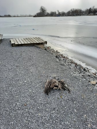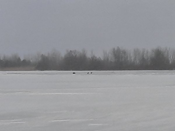 We took a look with our binoculars to have a look. Surprise! A bald eagle and a few turkey vultures are on the ice.