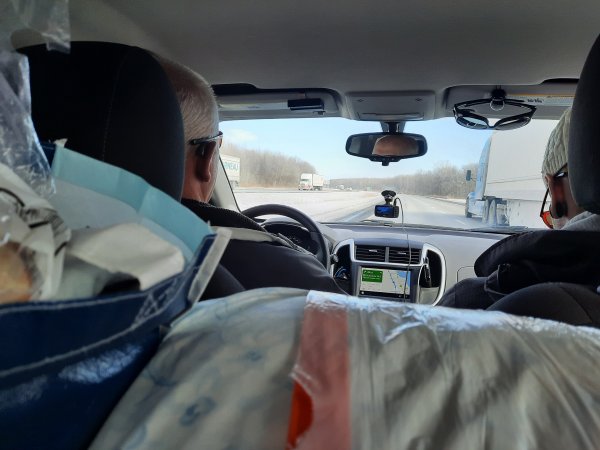 The car is so full. Even Michele is "surrounded" by bags in the back seat.