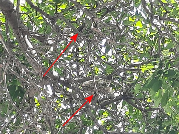 We found a bird's nest in the tree. We can see the nest and the birds.