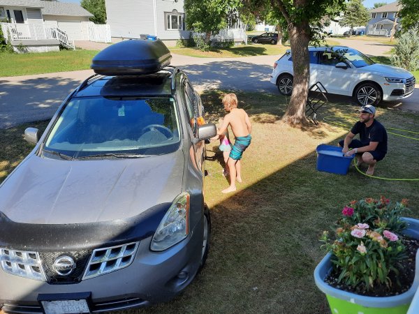 Gabriel and Natasha are helping daddy to wash the car.