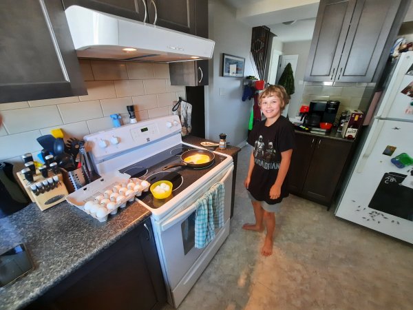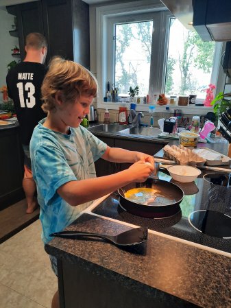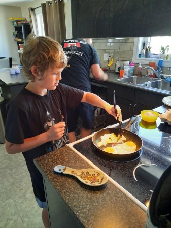 Gabriel is learning how to cook eggs this morning.