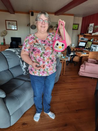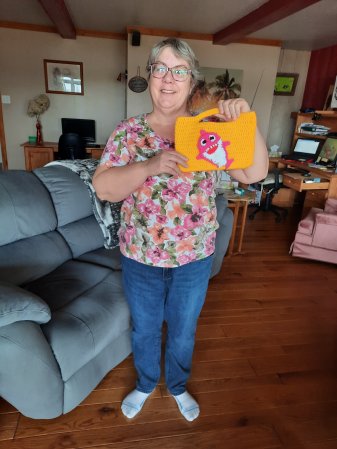 A handbag with Baby Shark on it. And another handbag with a cat on it.