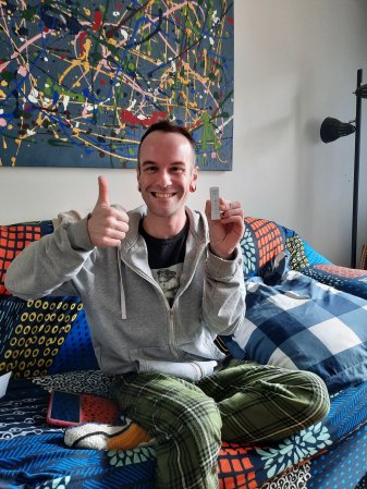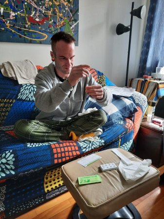 We gave one of our "Rapid Test Devices" to Benoit. He does one right away. The result is negative.